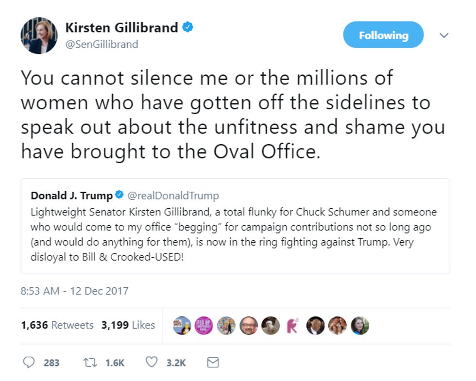 What's that old expression about bringing a knife to a gun-fight? We should make up a new version about how you shouldn't bring your tiny pathetic orange puss-grabbing hands to a Kirsten Gillibrand fight.