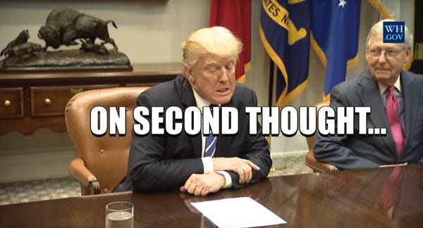 Trump is having second thoughts about sending all 800,000 of those poor Messicans kids back home with their free 'Murican ed-u-kayshunz, so he's issuing a six-month IOU if Congress doesn't get around to it.