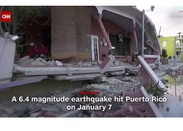 Puerto Rico was hit by a 6.4 magnitude earthquake Tuesday, followed by a series of aftershocks that have left many residents of the island sleeping outside or in shelters. The territory's still-fragile electrical grid was entirely offline for much of the day following the pre-dawn quake, but is being restored more quickly than following Hurricane Maria in 2017, which left much of Puerto Rico without electricity for months. Guess the grifters from Montana weren't involved this time out. The territory's power authority said today that power had been restored to 80 percent of customers, but NBC News reports it might take a year to fully fix one generating station that provides about a quarter of Puerto Rico's electricity.
