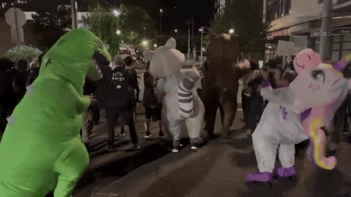 Portland remains resolutely not in ruins, however. Apparently the costume shops haven’t closed, or perhaps brave smugglers have brought inflatable costumes through the front lines.