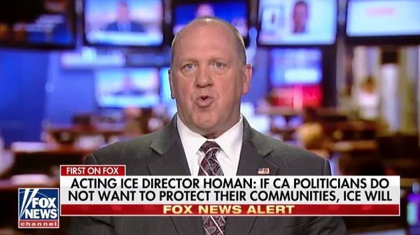 Thomas Homan, the acting director of Immigration and Customs Enforcement, thinks state and local political leaders who aren't on board with the Trump administration's War On Illegal Immigrants need to go to jail for their crimes. In an interview Tuesday with Fox News's Neil Cavuto, Homan, whom Trump wants to get the ICE job for good, insisted that municipal and state officials who pass any sort of "Sanctuary City" laws should be brought up on federal charges because refusing to go along with ICE's deport-'em-all agenda means they "knowingly shield and harbor" illegal aliens.