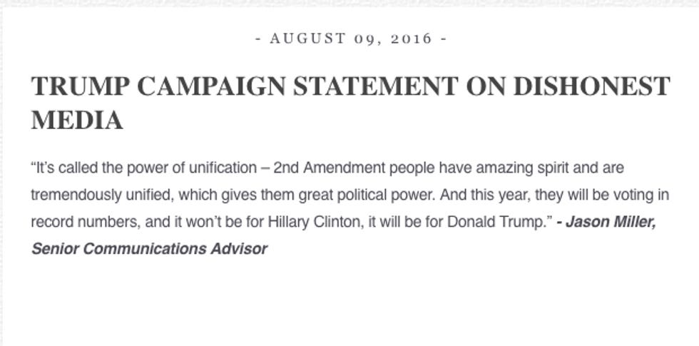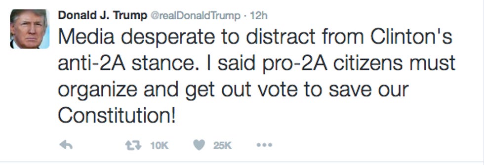 It is Wednesday, so Donald Trump is once again saddened and appalled at the way the media has totally misinterpreted and twisted the thing he said on Tuesday. This Wednesday, that thing happens to be the thing he said at a rally that sure sounded like he maybe was suggesting that "Second Amendment People" would have to assassinate Hillary Clinton to protect her from using the Supreme Court to overturn the Second Amendment. Which by the way, is not actually a thing the Supreme Court can do!