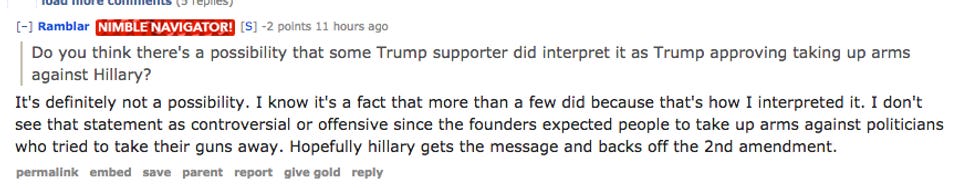 Although the thing is... uh, some Trump supporters certainly did interpret it that way, and see nothing wrong with it because they believe in all that "the purpose of the Second Amendment is so people can defend themselves against the government" thing. Which is, of course, why assassination is legal, George Washington was totes cool with the Whiskey Rebellion, and Abraham Lincoln let the South secede that one time.