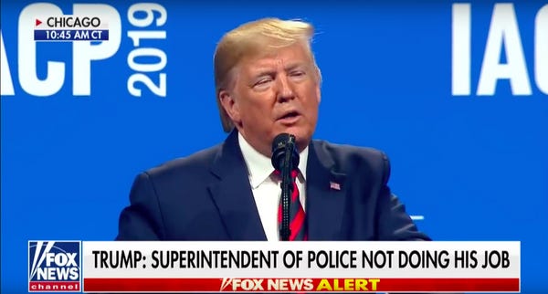 Trump was especially cranky because Chicago Police Department Superintendent Eddie Johnson skipped his tirade. Johnson, who is black, said listening to Trump's blather didn't line up with the city's "core values" or his "personal values." Rank-and-file police officers tend to like Trump and his unhinged Dirty Harry cosplay, and the Chicago police union's board of directors issued a vote of no confidence in Johnson last week. The union claimed that boycotting the speech "would be an insult to both President Trump and the office of the presidency itself." Trump doesn't need anyone's help insulting the office hestoleholds. Johnson didn't buckle and released this statement in response to the vote.