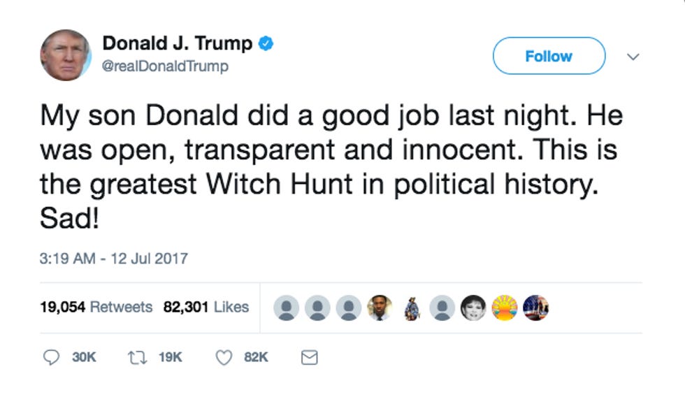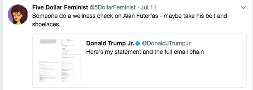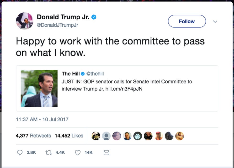 And let's not forget, Futerfas's client is an egomaniac who thinks he's the smartest guy in every room. He's like a walking proof of the Dunning-Kruger Effect . We are 100% certain that Mr. Futerfas advised his client to SHUT THE FUCK UP. Instead, DJ went on Hannity and announced via Twitter that he'd be delighted to appear before the Senate Intelligence Committee. No need for a subpoena!