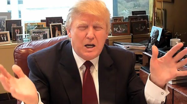 At the rate Donald Trump is scooping up key parts of the Republican base the real candidates are too afraid to be seen courting, his fake candidacy will have officially have won the real campaign in only a week or two. Who's he going after now? Racists. "I have a great relationship with the blacks. I've always had a great relationship with the blacks. But unfortunately, it seems that, you know, the numbers you cite are very, very frightening numbers," he told a radio interviewer when asked about Obama's support among African Americans. He loses points for saying he has a "good relationship" with "the blacks," but he definitely makes up for it by using the term "the blacks" and saying they only support Obama because he's black.