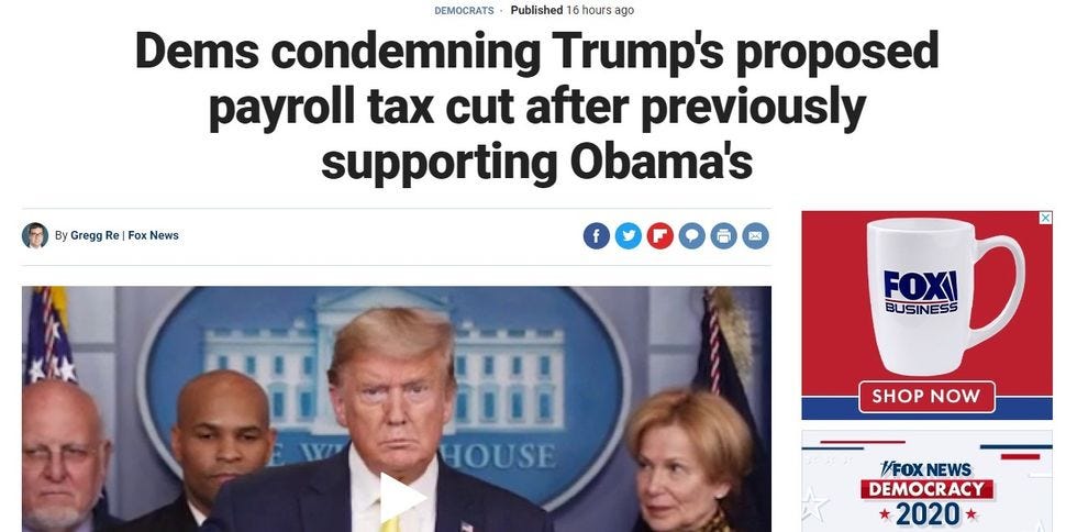 Fox News quickly got on the bandwagon Tuesday, with articles like " What Trump's payroll tax cut would mean for your wallet," andour favorite, which excoriated Democrats for playing politics with Trump's attempt to play politics with a public health crisis: