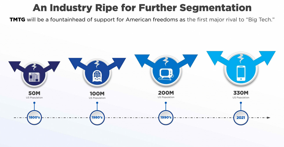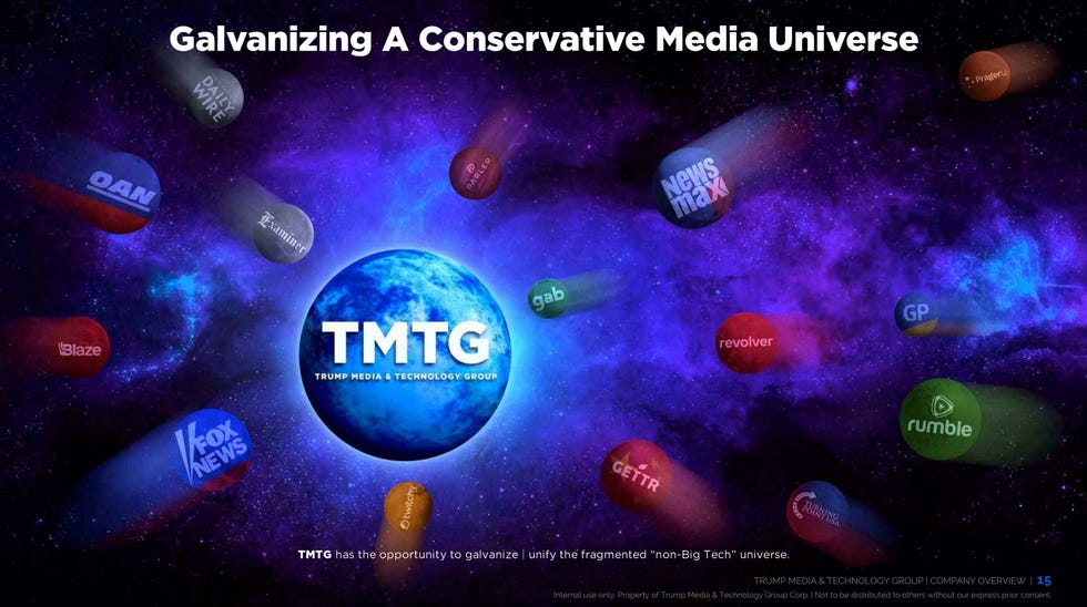 Behold the pitch deck for Trump Media & Technology Group, a "Mission Driven Organization" which will "fight for the First Amendment protections and freedoms of all Americans, protect democracy, and defend capitalism."
