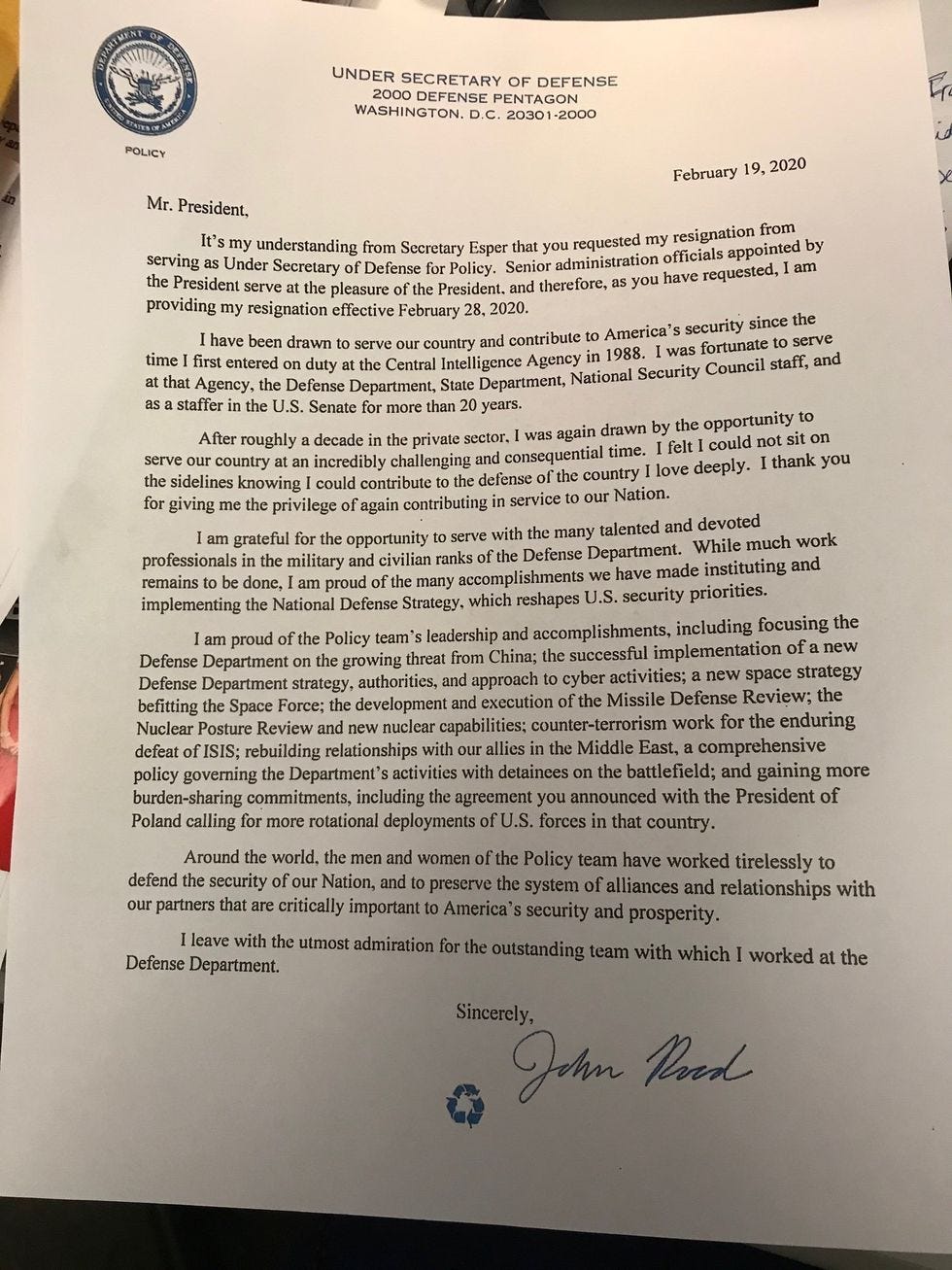 It's my understanding from Secretary Esper that you requested my resignation from serving as Under Secretary of Defense for Policy. Senior administration officials appointed by the President serve at the pleasure of the President, and therefore, as you have requested, I am providing my resignation effective February 28, 2020.