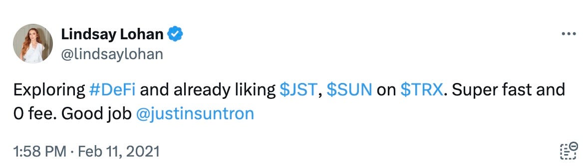 As it turns out, Sun is a little bit of an accused crypto-scammer himself, can you even believe it? The Securities and Exchange Commission (SEC) is currently prosecuting him for fraud, hide your surprise! In March of 2023 he was charged with unregistered offer and sale of the crypto asset securities Tronix (TRX) and BitTorrent (BTT) and for “manipulating the secondary market for TRX through extensive wash trading, which involves the simultaneous or near-simultaneous purchase and sale of a security to make it appear actively traded without an actual change in beneficial ownership, and for orchestrating a scheme to pay celebrities to tout TRX and BTT without disclosing their compensation.”