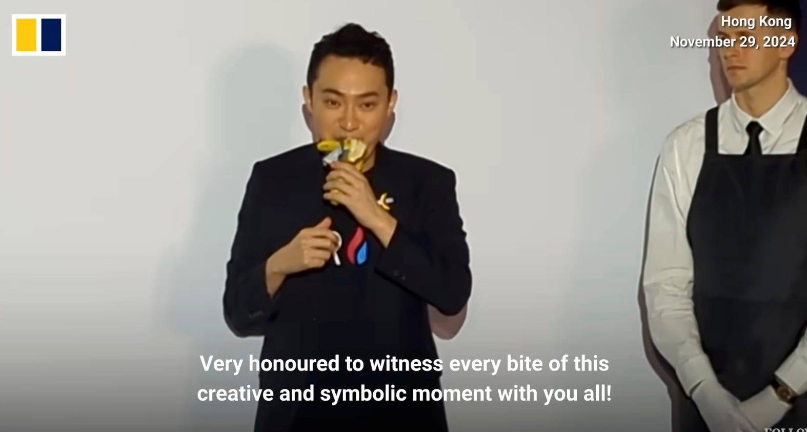 Well, wonder no more. First past the post is Chinese crypto entrepreneur Yuchen “Justin” Sun! If that name sounds familiar, it’s because Sun just purchased Maurizio Cattelan’s $6.2 million conceptual art piece of a banana taped to the wall, and conspicuously consumed it at a press conference in Hong Kong, gleefully exclaiming, “It tastes much better than other bananas. Indeed, quite good. [...] I will personally eat the banana as part of this unique artistic experience, honoring its place in both art history and popular culture.”