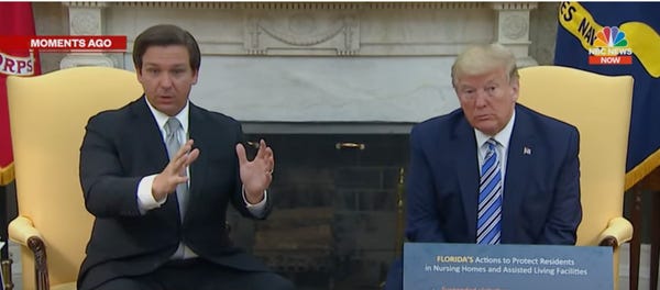 Trump insists that he “gave” DeSantis and other governors the right to manage the pandemic however they chose. That’s not how the Constitution works but it’s still unclear if he’s read the document.