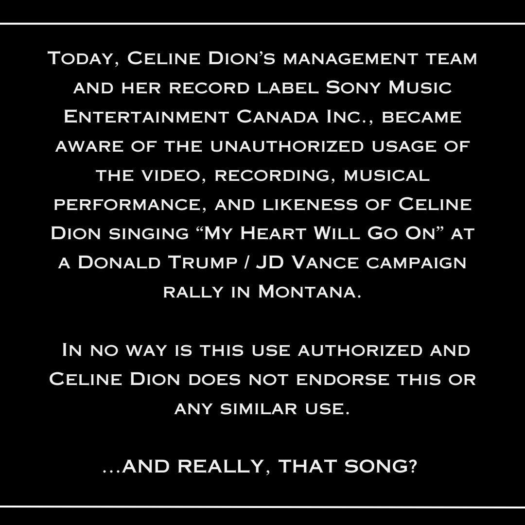 The other musician now threatening Trump with unauthorized use of her music is Céline Dion, who is both mad and a little befuddled about the Trump campaign’s musical choices. Which, join the club: