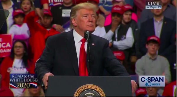 Donald Trump gave one of his 50 minutes of hate rallies in Green Bay, Wisconsin, Saturday night. It was his usual marathon of lies with no bathroom breaks. He slimed Wisconsin Governor Tony Evers for refusing to sign a ridiculous "don't kill babies" bill with a "stop beating your wife" rider. Then hereprised his grossest lie yet about how women are murdering their newborn babies for spit and giggles.