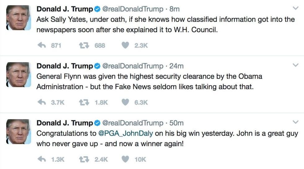 Since Yates is scheduled to testify today at 2: 30 Eastern (and yes, we will be liveblogging), Donald Trump went on the twitter to say it was Barack Obama's fault Flynn got security clearance in the first place! How come nobody is blaming Obama, HENGH? Hell, if they could blame him for George Bush's response to Hurricane Katrina, surely they could blame him for Flynn, whom he had hired in the first place! (And whom he'd then fired, for being a crazy dick.) Not so fast, said Barack Obama (okay, three Obama officials) who then called NBC News to rat out Trump for being a stupid idiot who lies.