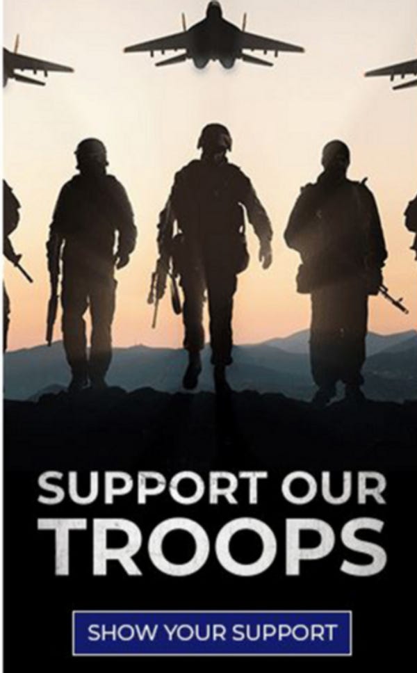 This time they were doing a SUPPORT THE TROOPS ad, because of how everybody knows now that Trump literally hates the troops, especially if they do something he thinks is very stinky like die or get maimed while serving their country. They have to try something to make it look like Donald Trump does not actually hate the troops.