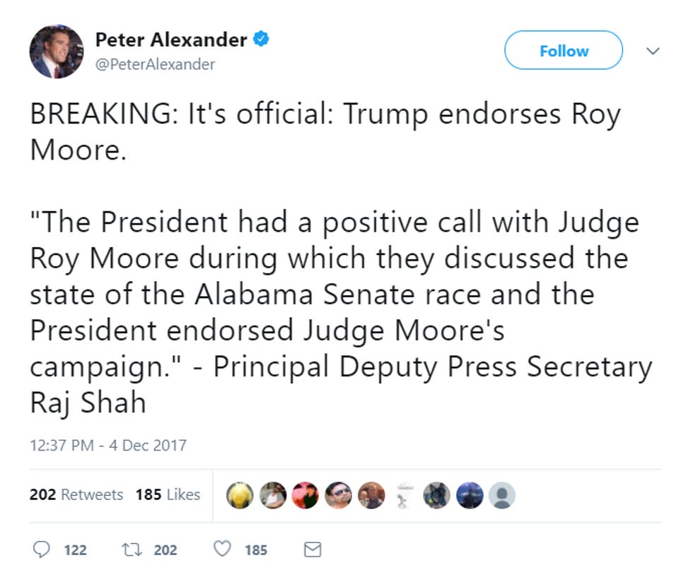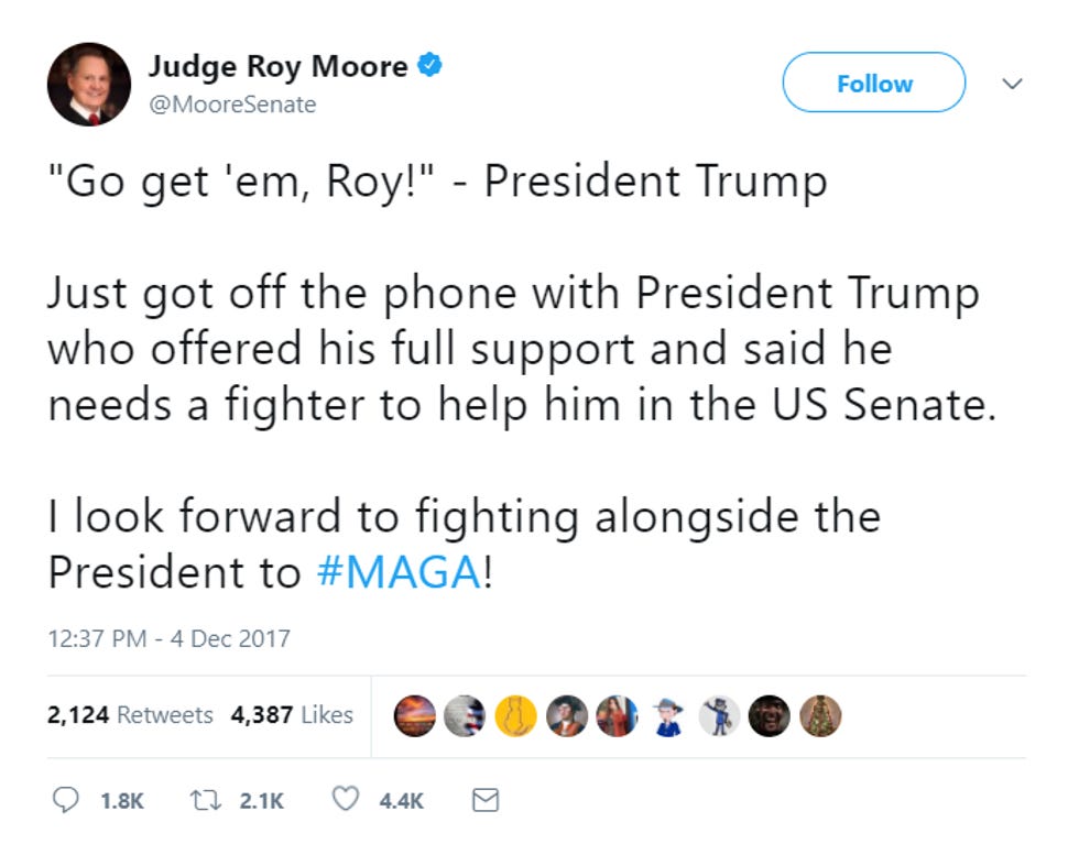 Feel free to try to figure out what "MAGA" stands for when Roy Moore says it in the comments. Probably "Make America Grope Adolescents" or something.