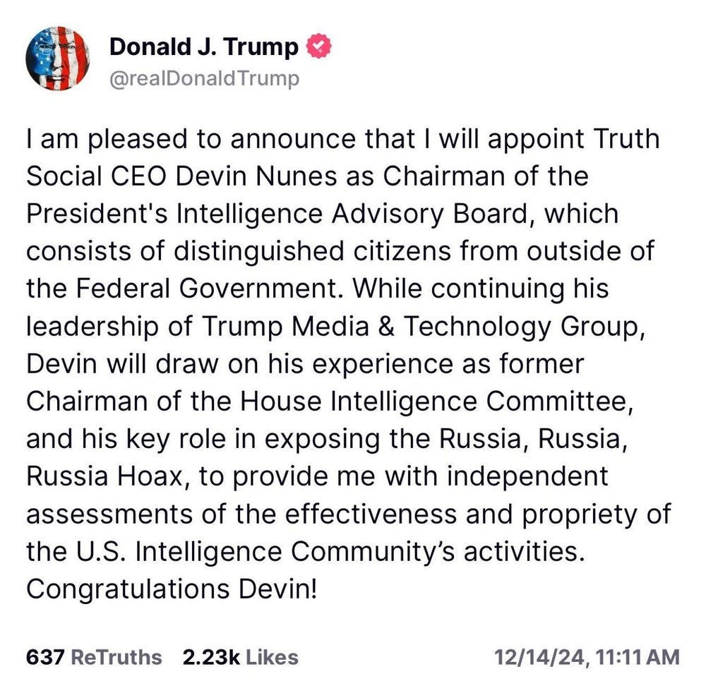 Nunes eventually resigned from Congress to become CEO of the Trump Media and Technology Group, the parent company of Trump’s vanity social media product and Nazi safe space Truth Social. He will soon be taking on an additional gig, as chairman of the President’s Intelligence Advisory Board: