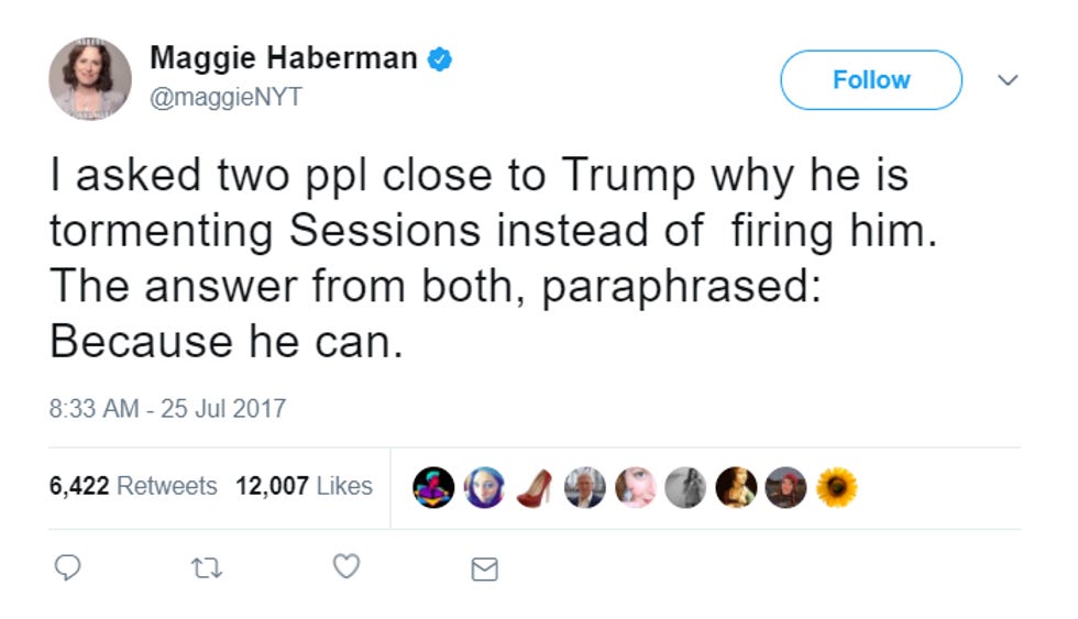 So what's up? Is Trump just fucking around and tormenting Jeff Sessions because he can? According to the New York Times 's Maggie Haberman, that's part of it:
