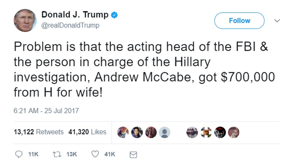 Oh yes, he is still so very pissed off, because Attorney General Jeff Sessions decided to follow the law and recuse himself from the Russia investigation, instead of helping Trump consolidate his tinpot dictator power. You see, if Sessions wasn't recused, he could fire that mean special counsel Robert Mueller, who is being very unfair by doing exactly what Deputy Attorney General Rod Rosenstein told him to do, and investigating collusion between the Trump campaign and Russia, AND ALSO any other things that come up related to that investigation. He's following the money! He might be leafing through Trump's tax returns RIGHT THIS SECOND.