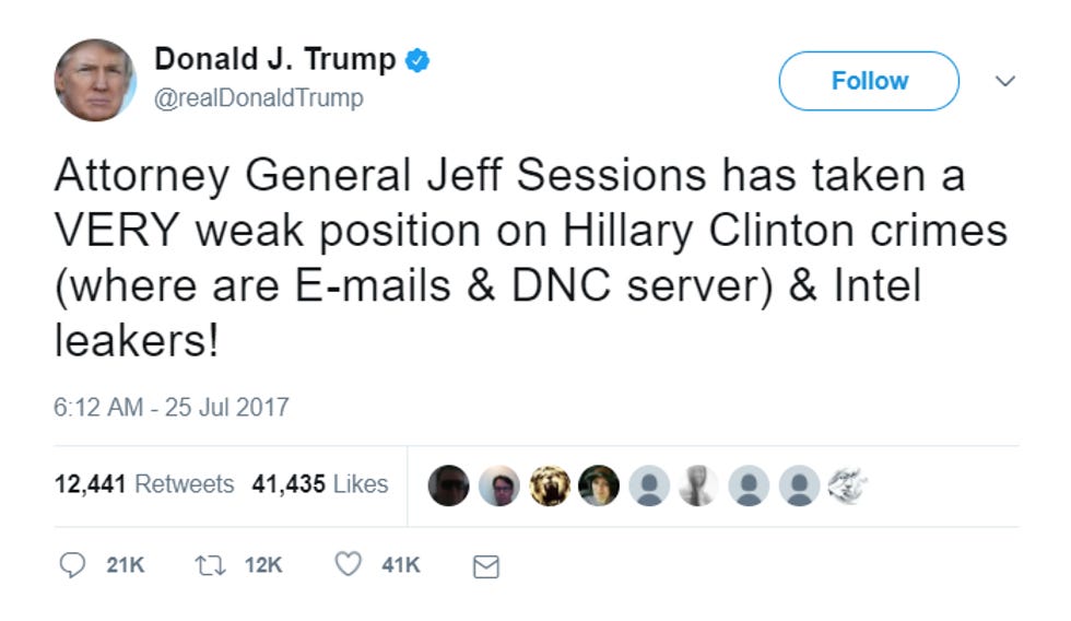 You see, if Trump fires Sessions or convinces him to quit, then he could put in an attorney general willing to wipe his ass with the Constitution and subjugate the rule of law to the petulant fuckbaby wishes of Donald J. Trump, the barely elected Complainer-In-Chief, and fire Mean Man Mueller.