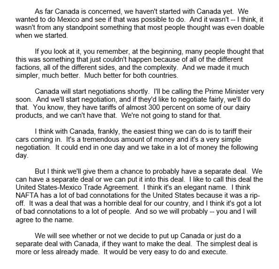 How 'bout we pry off Mexico for separate negotiations, and then five minutes before the buzzer present the deal to Canada and tell them, "Take it, or leave it"? Yeah, it's a dumb plan. But that's how Donald Trump wound up in a press conference this morning waving around a handful of concessions on car manufacturing from Mexicans and pretending it was a fully negotiated bilateral trade deal to replace NAFTA.