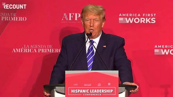 He finished this section by saying for no apparent reason that "over four incredible years we did more for the Hispanic community than any administration in the history of our country." Why does he say that? Why wouldn't he say that? They were the words that traveled out of his brain and into his colon and out of his voicebox right then. Just like at other times he said "woke banks" and "teesh transhgender" and "the cartels have Mar-a-Lagos" and all the other words.