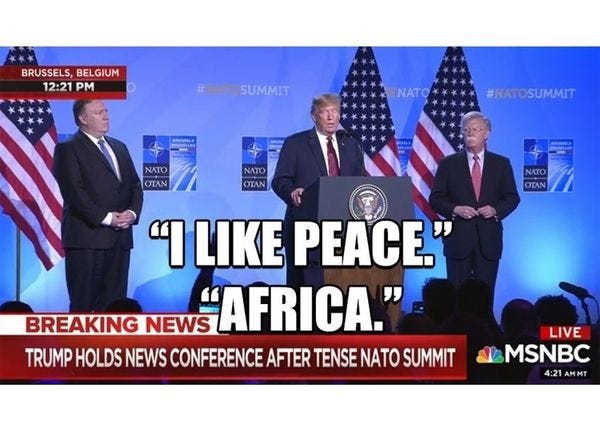 Trump apparently ran out of space in his central processing unit, since he soon began pulling lines from previous statements out of his cache, if you know what we mean. He said NATO is strong like bull, and "a fine-tuned machine" -- just as he's described his White House, a comparison that ought to scare anyone. A reporter asked if he'd trash the allies once he was in flight, as he attacked Canada after the G-7, and he said that wouldn't happen because he's "a very stable genius." Yes, he said it again, because it went over so well the first time.