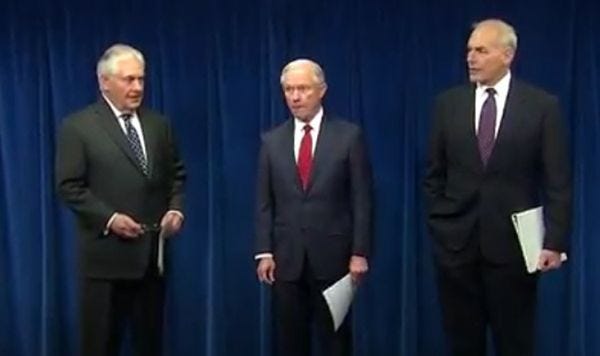 A bit more than a month ago, the Trump Gang proudly unveiled the first version of Trump's definitely-not-a-Muslim ban, which put travel on hold for everyone from seven majority-Muslim countries that lack Trump hotels and also paused all refugee resettlement, with an indefinite stop to refugees from Syria, too. Today, after courts kept saying Travel Ban 1.0 was unconstitutional, Trump sent Secretary of State Rex Tillerson, Attorney General Jeff Sessions, and Homeland Security director John Kelly out to announce Trump has signed Travel Ban 2.0, a new and improved fig leaf the administration hopes will satisfy Trump's Muslim-ban-desiring supporters (it probably will) and stop terrorist threats to the USA (probably won't, any more than it prevents rogue dodo attacks), all without being laughed out of court (Who knows?).