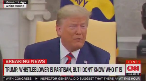 Trump also said in the Oval Office that he doesn't know who the whistleblower is, which would seem to contradict his Twitter statement about them being "highly partisan," until you remember the thing we said in the last graf about how literal actual diarrhea falls out of the president's mouth in toxic wet puddles every time he opens his mouth. He did note that he heard the person is very "partisan," probably the same place he heard about Joe Biden's "statement."