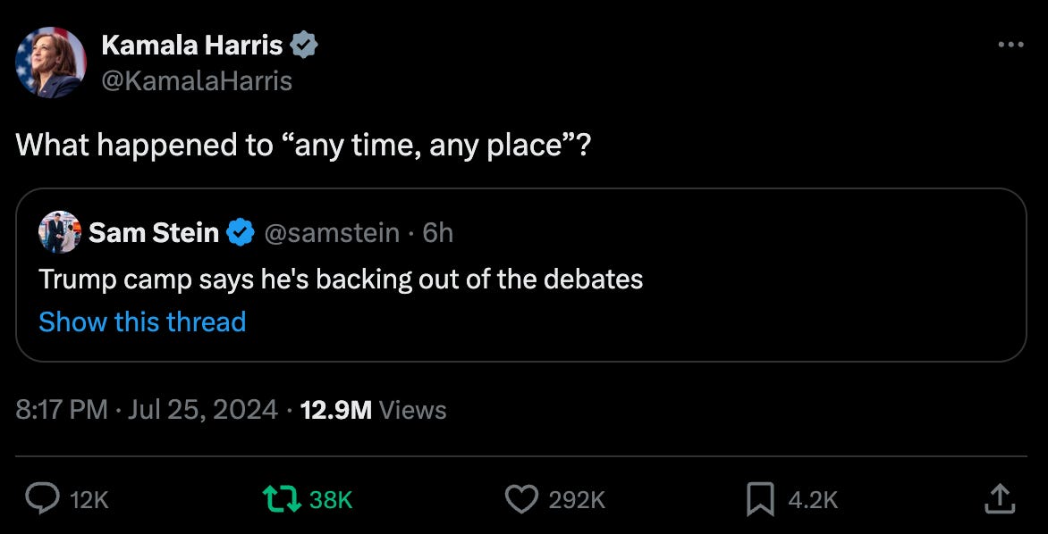 Harris said Trump had previously agreed to a September 10, “now he’s backpedaling, but I’m ready. And I think the voters deserve to see the splitscreen that exists in this race on the debate stage. And so, I’m ready, LET’S GO.”