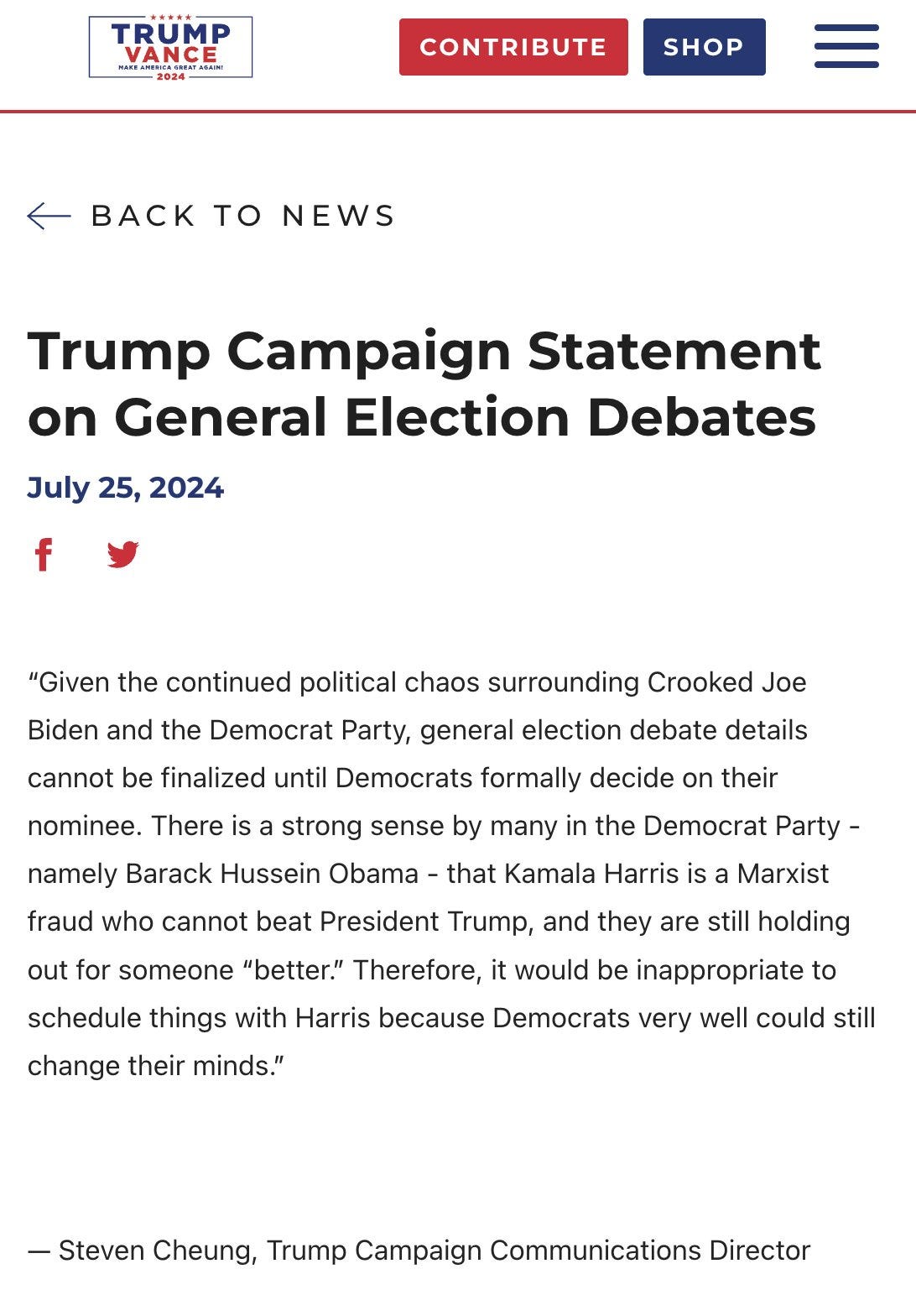 Acyn provides one more funny video, it is of Sean Hannity. Y’all know how Sean Hannity is probably the stupidest person in the whole entire Fox News lineup, at least in the eyes of Rupert? Here is Hannity reporting first that Trump is weenus-ing out of the debates, and immediately afterward reporting that Barack and Michelle Obama are about to endorse Kamala Harris, apparently blissfully ignorant of how the press release from Trump (above) is full of masturbation wishes and excuses that there is CHAOS! in the Democrats, and Obama is looking for somebody new to endorse, and that Trump can‘t possibly commit to debates until that’s all sorted.