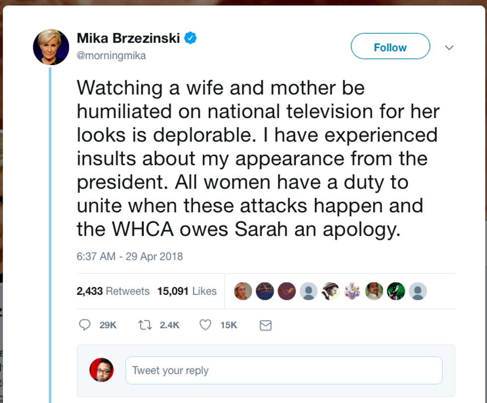 This is a very carefully written tweet. It's also printed on what amounts to a white flag. It focuses on what is believed to matter to Americans -- the memory of 9/11 -- and not on Ilhan Omar, the human being against whom the president is raising a lynch mob. Politicians from either political party didn't have trouble saying Sarah Huckabee Sanders's name when she was denied fine dining or when Michelle Wolf made jokes about her in public. It was also frequently pointed out that Sanders is a mother. So is Omar. Lindsey Graham specifically sent a message to Brett Kavanaugh's daughters during his confirmation hearings.