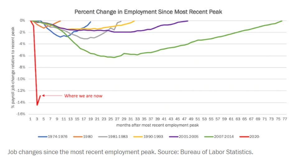 Over at the Washington Post Catherine Rampell shared this chart from the Bureau of Labor Statistics of where we are, compared to other recessions: