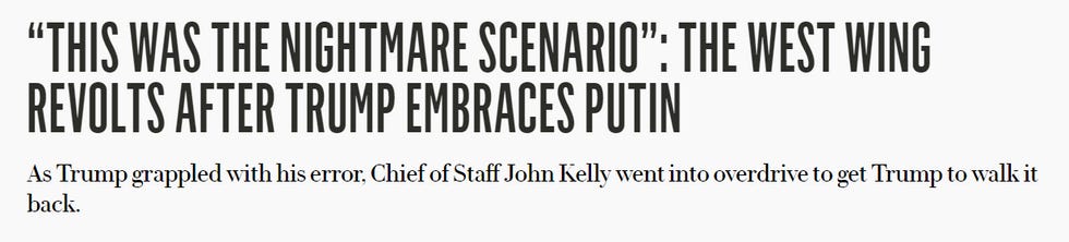 Apparently John Bolton wanted Trump to double down on being a traitor, but John Kelly was PISSED AT TRUMP and even called Congress and gave Republican leaders permission to mildly criticize the president. (In case you were wondering where those milquetoast condemnations from Paul Ryan and Mitch McConnell came from!)