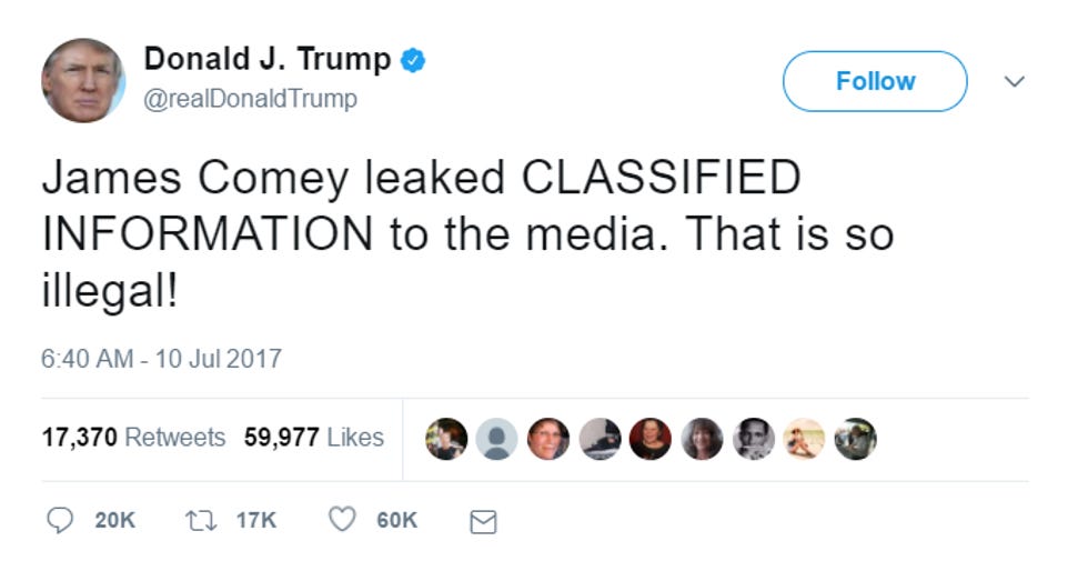 First of all, like most thoughts that originate in Trump's anal canal and then somehow find their way into his brain, this is a lie. Comey did not leak classified information to the media. Comey leaked a memo to his friend and asked him to give it to a reporter. It is a memo we all know about, and there was nothing classified in it. Comey wrote many other memos about his encounters with President PussGrab, a few of which contained secret or classified information. He has turned all of those over to special counsel Robert Mueller. Comey explained this during his testimony before the Senate Intelligence Committee. In fact, moron GOP Senator Roy Blunt asked Comey for clarification on that very point, and he gave it. ALSO TOO, in fact, Comey had an interesting exchange with Democratic Senator Mark Warner, vice chair of the committee, where he explained that he specifically wrote the memo we all know about, where he describes the Oval Office meeting wherein Trump tried to obstruct justice by the pussy and get the FBI to stop investigating Michael Flynn, in such a way as to make sure it DID NOT have classified information in it. That way, he could share it if it became necessary. (SPOILER: It became necessary.)