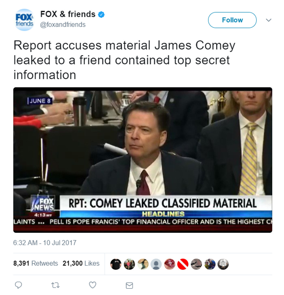 Since this is all well-established fact at this point, why is FuckPuddle McOrange tweeting about it right now, besides maybe to distract everyone from how his son, FuckPuddle Junior, is under fire for trying to do ACTUAL COLLUSION with Russia? Oh just the usual. Trump was watching "Fox & Friends" in his ketchup-stained nightgown and they did a BIG EXCLUSIVEBULLSHITBOMBSHELL REPORT on how Comey allegedly leaked classified information to his BFF, and thus, "broke the rules":