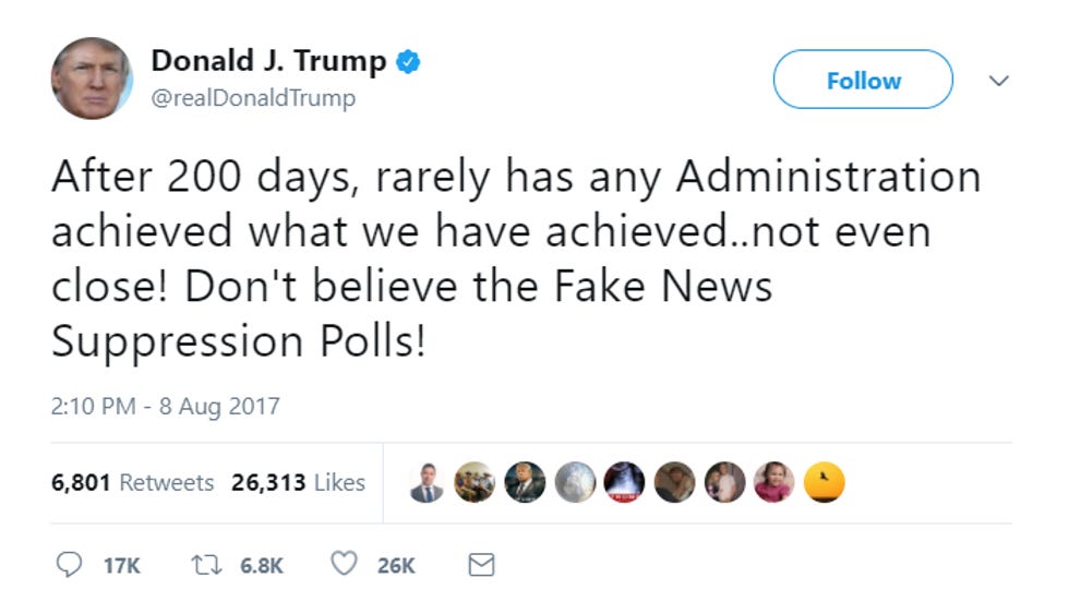 But please rest assured that your president, Donald J. Trump, is SANE and a GROWN-UP and understands his JOB, and that, even if he is on golf-cation at Bedminster, he has his eyes laser-focused on protecting America, and on working with our allies and our half-allies and even hostile nations to protect THE WHOLE WORLD from this emerging ...