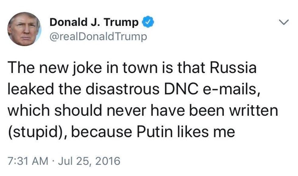 Oh well, we are excited to report that the president's day just got worse, because Robert Mueller has dropped indictments on 12 members of Russian military intelligence (GRU), both for hacking and for direct election interference , which provides a lovely backdrop for Trump's upcoming summit with Vladimir Putin in Helsinki on Monday. One thing's for sure though -- PUTIN SAYS RUSSIA DIDN'T DO IT, AND TRUMP BELIEVES HIM.