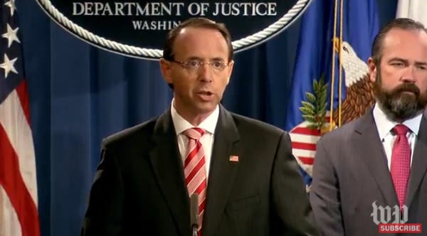 Attorney General Rod Rosenstein announced the new indictments in a press conference Friday, saying he briefed Trump on them before Air Force One transported the president's massive ass across the Atlantic Ocean. There are no Americans indicted -- so far -- but the document certainly alludes to Americans without naming them, like Roger Stone, and at least one Republican congressman, about whom we shall wildly speculate later in this post!
