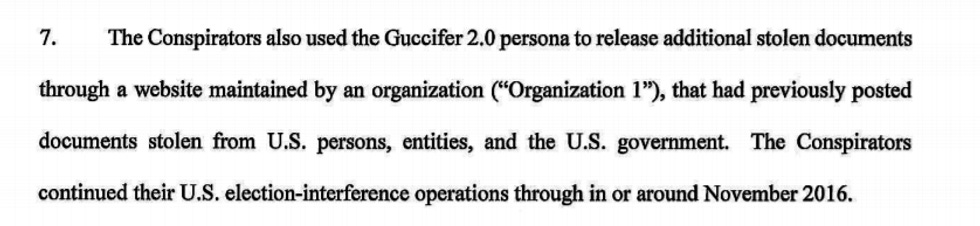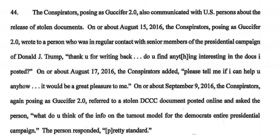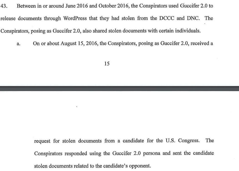 Oh, and one time Guccifer 2.0 "received a request for stolen documents from a candidate for the U.S. Congress. The Conspirators responded using the Guccifer 2.0 persona and sent the candidate stolen documents related to the candidate's opponent":