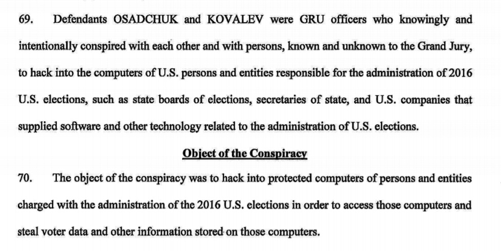 [Defendants conspired] to hack into the computers of U.S. persons and entities responsible for the administration of 2016 U.S. elections, such as state boards of elections, secretaries of state, and U.S. companies that supplied software and other technology related to the administration of U.S. elections.