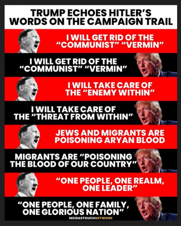 Here’s that handy graphic from MeidasTouch, the one that shows all the Trump words next to the Hitler words, surprise they’re basically the same.