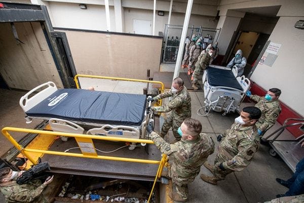 Oh yes, and there's another nifty downside for the 44 states (and DC) where Guard members are at war with what Trump likes to call "the invisible enemy": Since every Guard member will need to self-quarantine for two weeks before heading home, the effective end of the federal deployment will be in early June. States can keep members of their Guard units active, but that would be very spendy, about "$9 million per month for every 1,000 troops, according to the National Council of State Legislatures." And the state deployment wouldn't count toward any of those federal benefits, either.