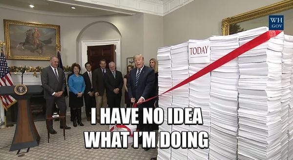 In a bizarre PR stunt, Trump touted his administration's rampant destruction of federal regulations by cutting a ribbon. Don't worry, it didn't make sense to the press corps either.