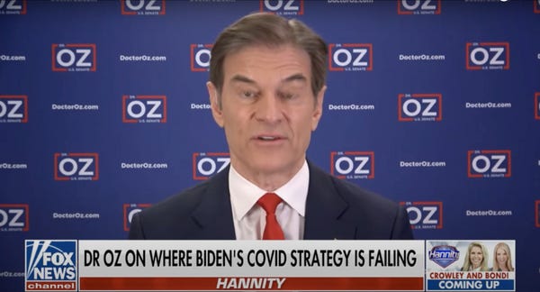 Trump's endorsement thrilled Dr. Oz so much he posted the video without the broadcaster’s logo. The Right Side Broadcasting Network, which airs this crap live, was miffed: "We know our videos when we see them. Next time, please leave up the graphics. It’s a nice courtesy to networks like us who work hard to provide coverage of Trump-endorsed candidates like yourself."