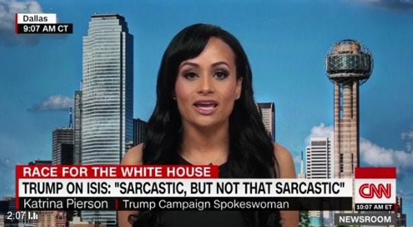 Trump campaign spokeswoman Katrina Pierson says "Barack Obama went into Afghanistan" https: //t.co/6OZtrfIwim https: //t.co/K1Sa9ViwmW