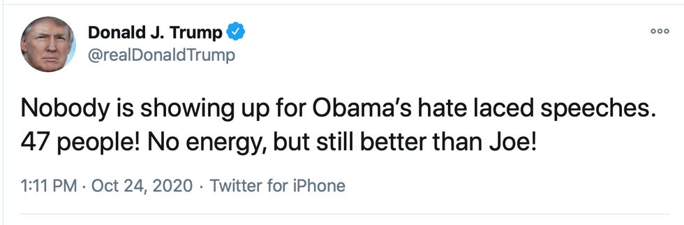 Obama's Philadelphia “drive-in" rally wasn't open to the general public, and in-person attendance was deliberately limited. Unlike Trump, Obama cares about human life other than his own. He's also “human" beyond simply the biological sense that technically includes Trump.