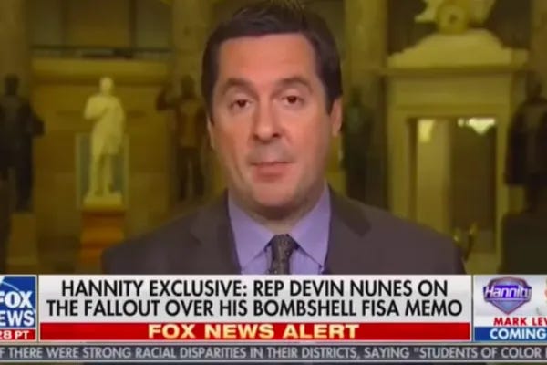 The dossier (sorry, not sorry) was largely compiled by the House Intelligence Committee in 2018 under the leadership of Trump’s chief panty sniffer Devin Nunes. Nunes has since wandered off to become a sick joke in the private sector, where he’s currently the head of Trump’s media company. (Don’t worry, he still finds time to file garbage SLAPP suits.) But in 2018, he was the chair of Intel, where he spent his days trying to destroy the intelligence community and showing his whole ass to the world.
