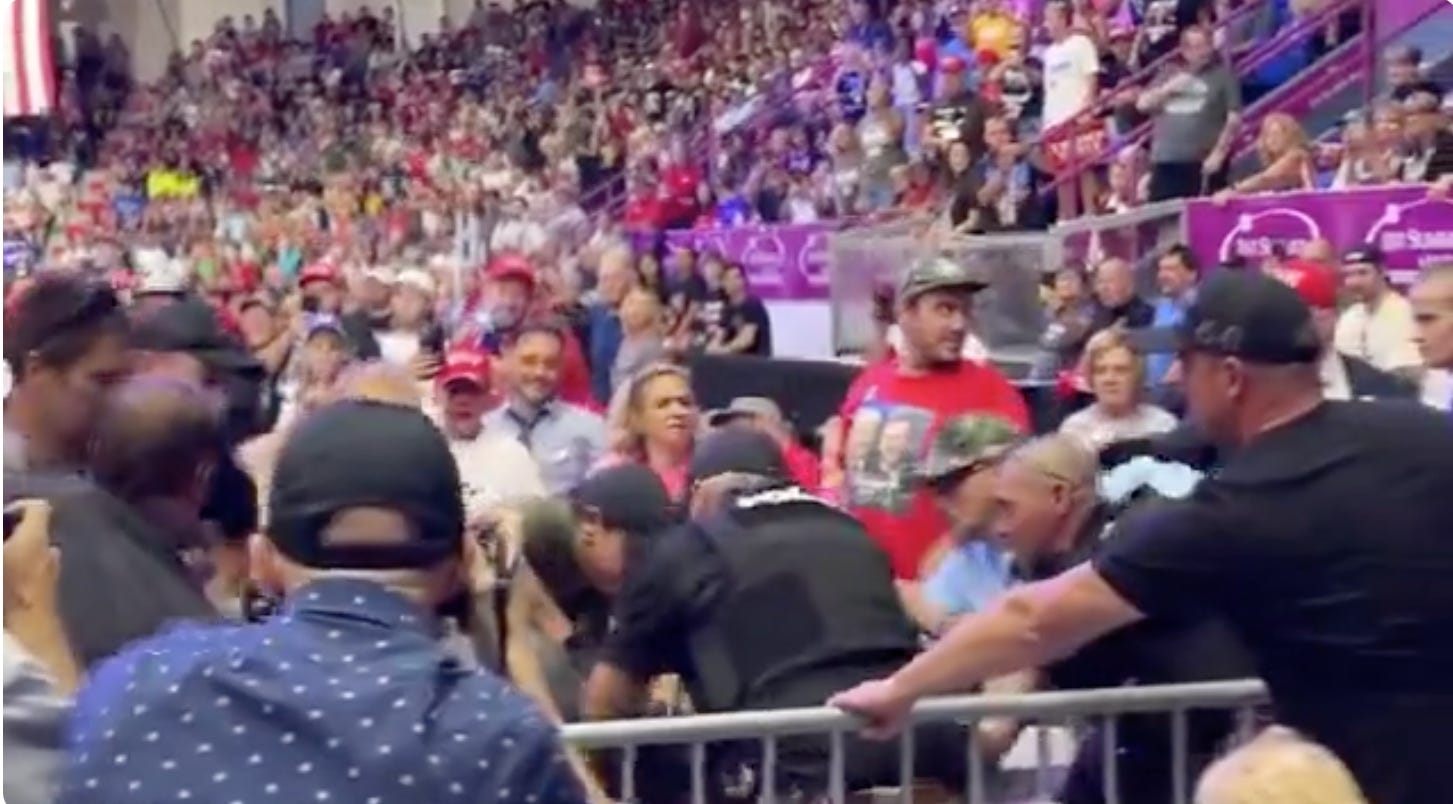In this video posted by CBS reporter Taurean Small, you can see the incident, as well as hear Trump babbling at his rally crowd about “he’s on our side” and God knows what else, starting around 30 seconds in.